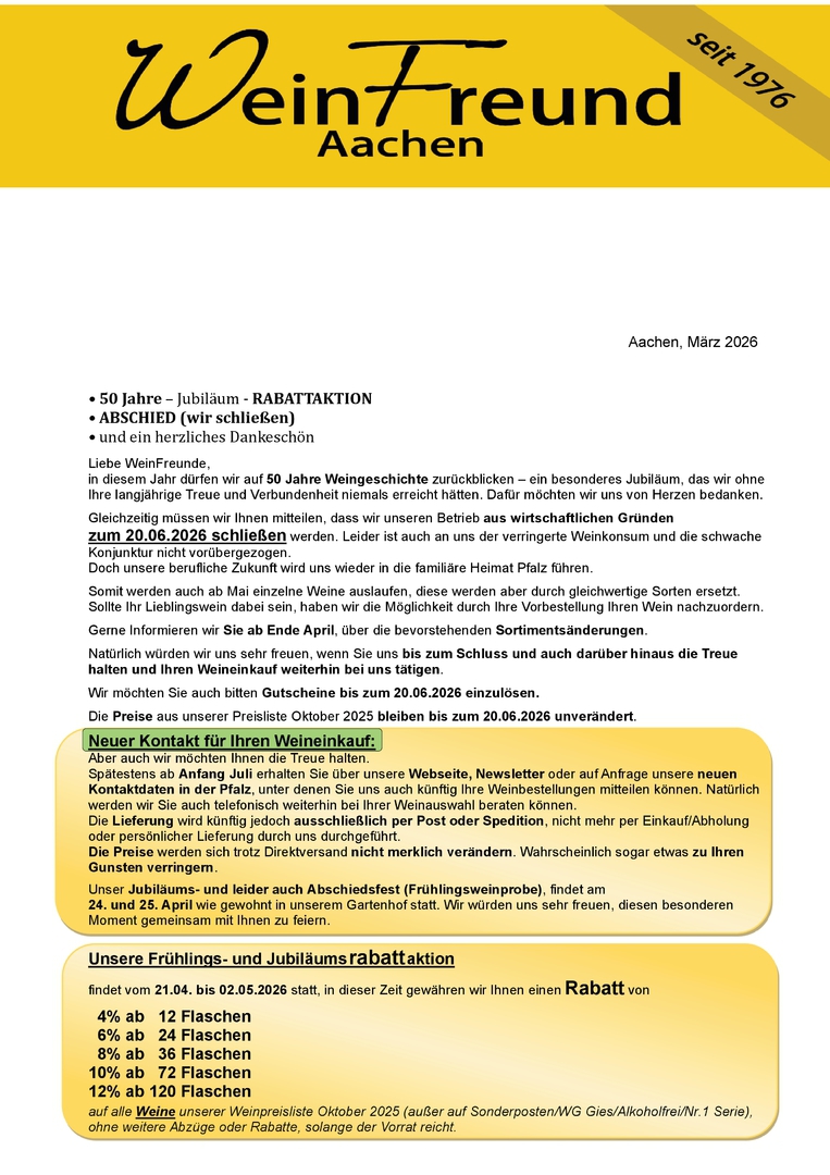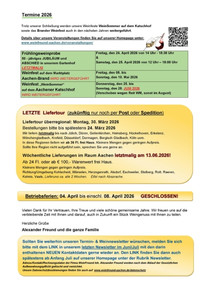 Bleiben Sie immer auf dem neusten Stand und melden Sich für unseren Newsletter an. Hier erhalten Sie 5-6 mal im Jahr alle Neuigkeiten und Termine zu unseren Weinproben, Weinfesten und Aktionen.